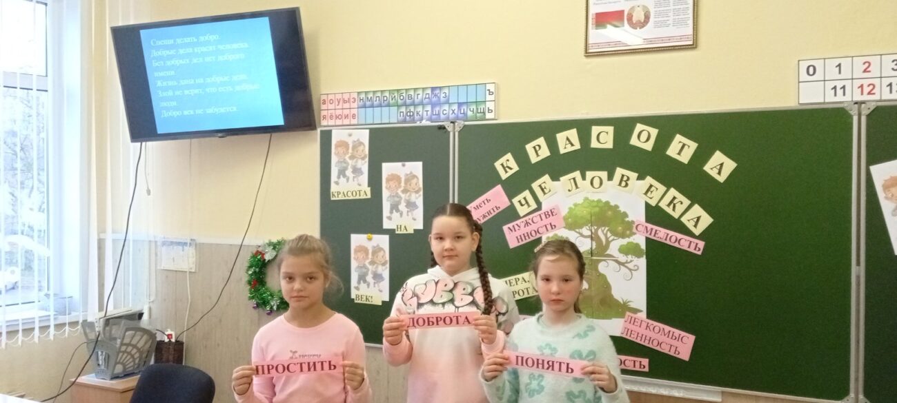 Среди учащихся 3-х классов прошло мероприятие «Красота человека — это значит…», формирующее у учащихся понятие о красоте, которая проявляется не только в эстетике, но и в благородных поступках. Ребята с большим удовольствием принимали активное участие в беседе с элементами инсценировок, формирующих нравственные ценности.