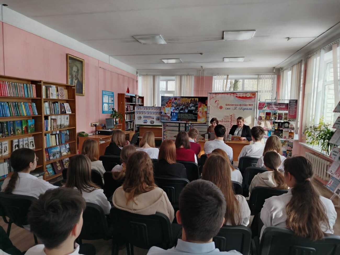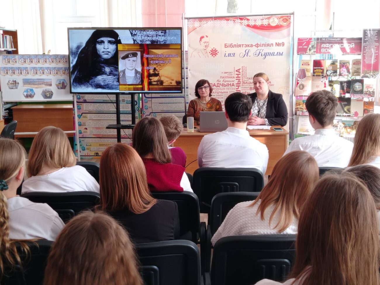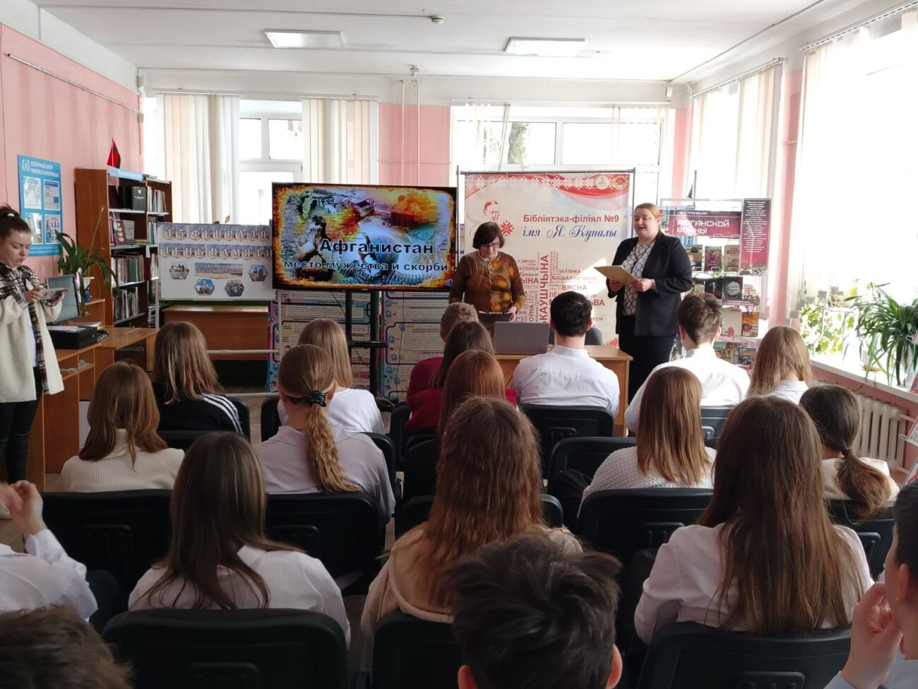 В рамках республиканской декады гражданско-патриотических дел «Афганістан у лесах нашых землякоў», с целью напомнить молодому поколению о событиях той эпохи, рассказать о героях, исполнивших свой военный долг далеко от Родины, 16 февраля 2026 года в библиотеке-филиале имени Я. Купалы для учащихся 8 «В» класса прошел информационный час «Афганистан – место мужества и скорби».