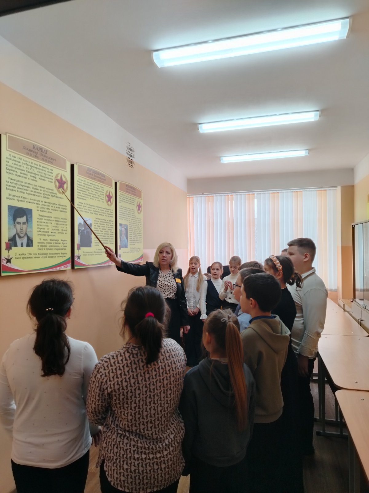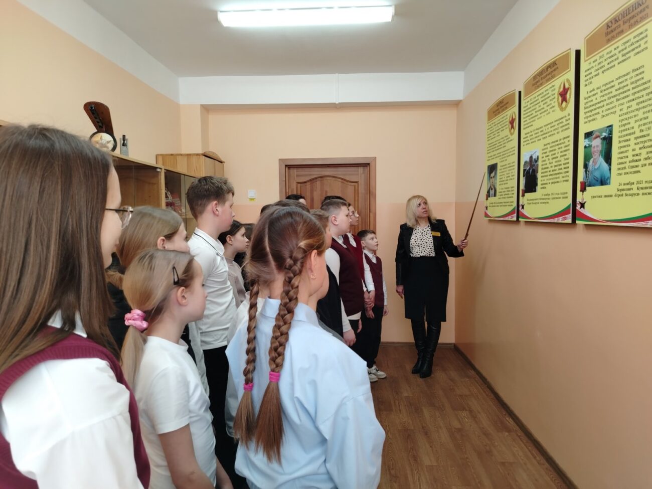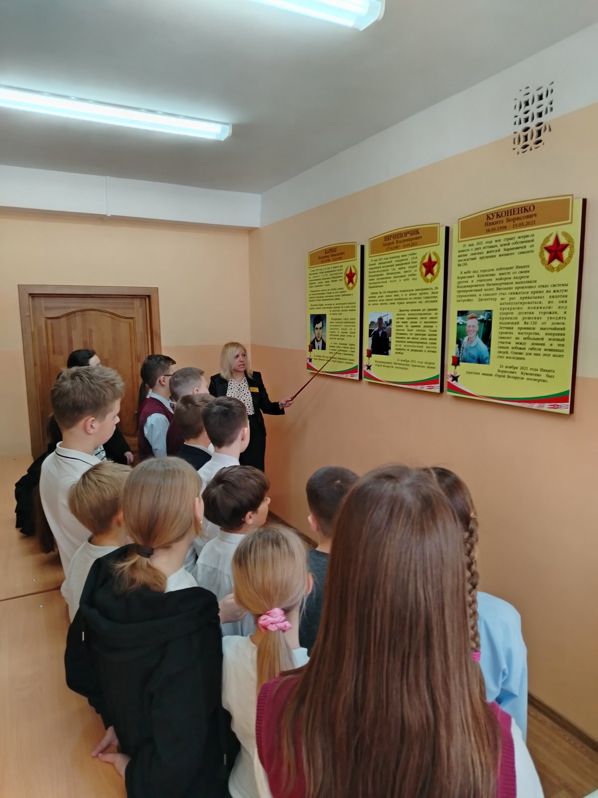 Руководитель по военно-патриотическому воспитанию Ковалева А.Ф. с помощью информации, размещенной на тематических стендах, рассказала ребятам о совершенных подвигах в мирное время Героями Беларуси.