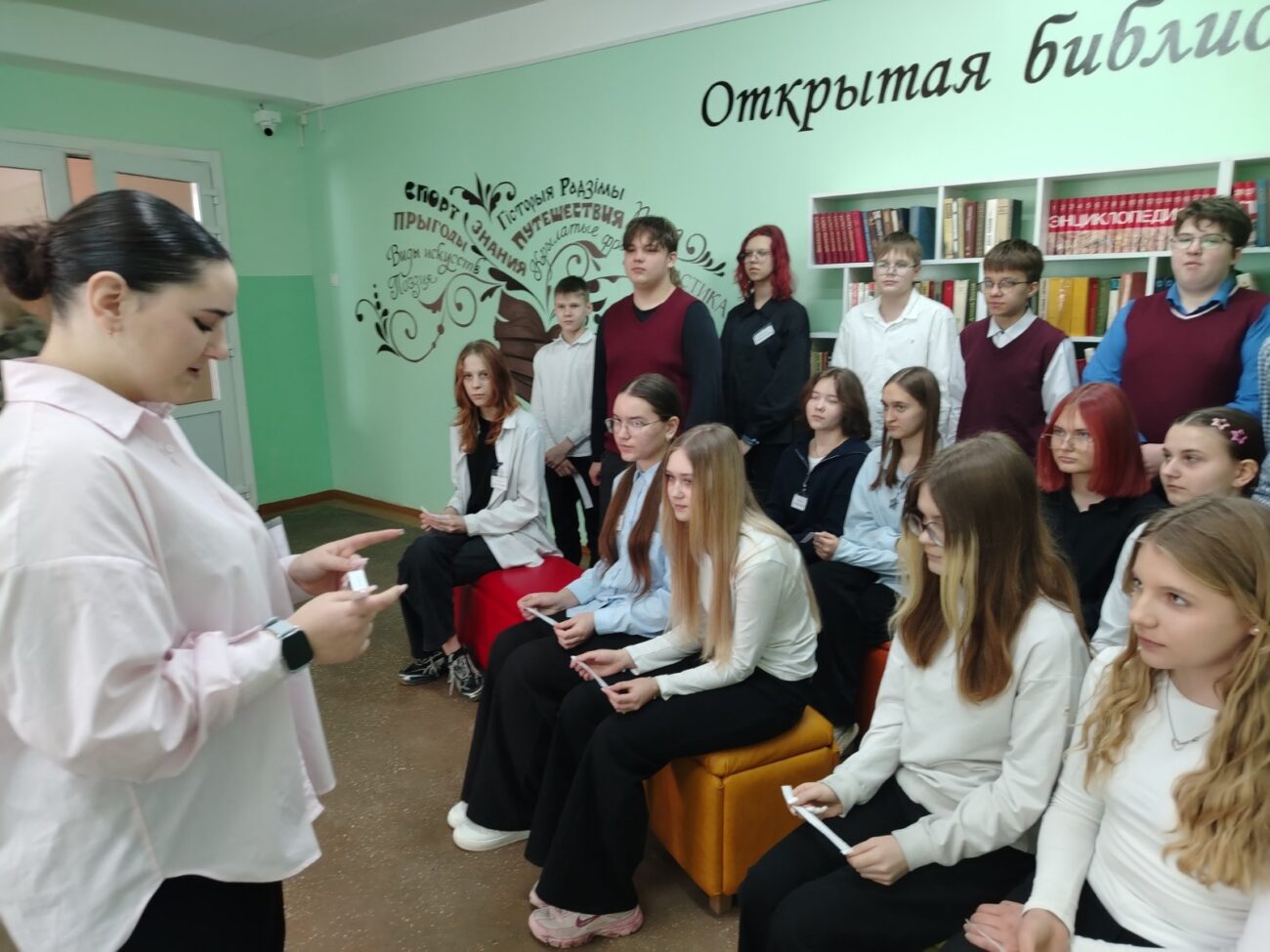 В открытой библиотеке «Любимая книжка», расположенной в фойе школы, руководитель по военно-патриотическому воспитанию предложила ребятам по тематике квеста выполнить задание «Секретное донесение», в котором школьники пытались разгадать зашифрованную фразу.