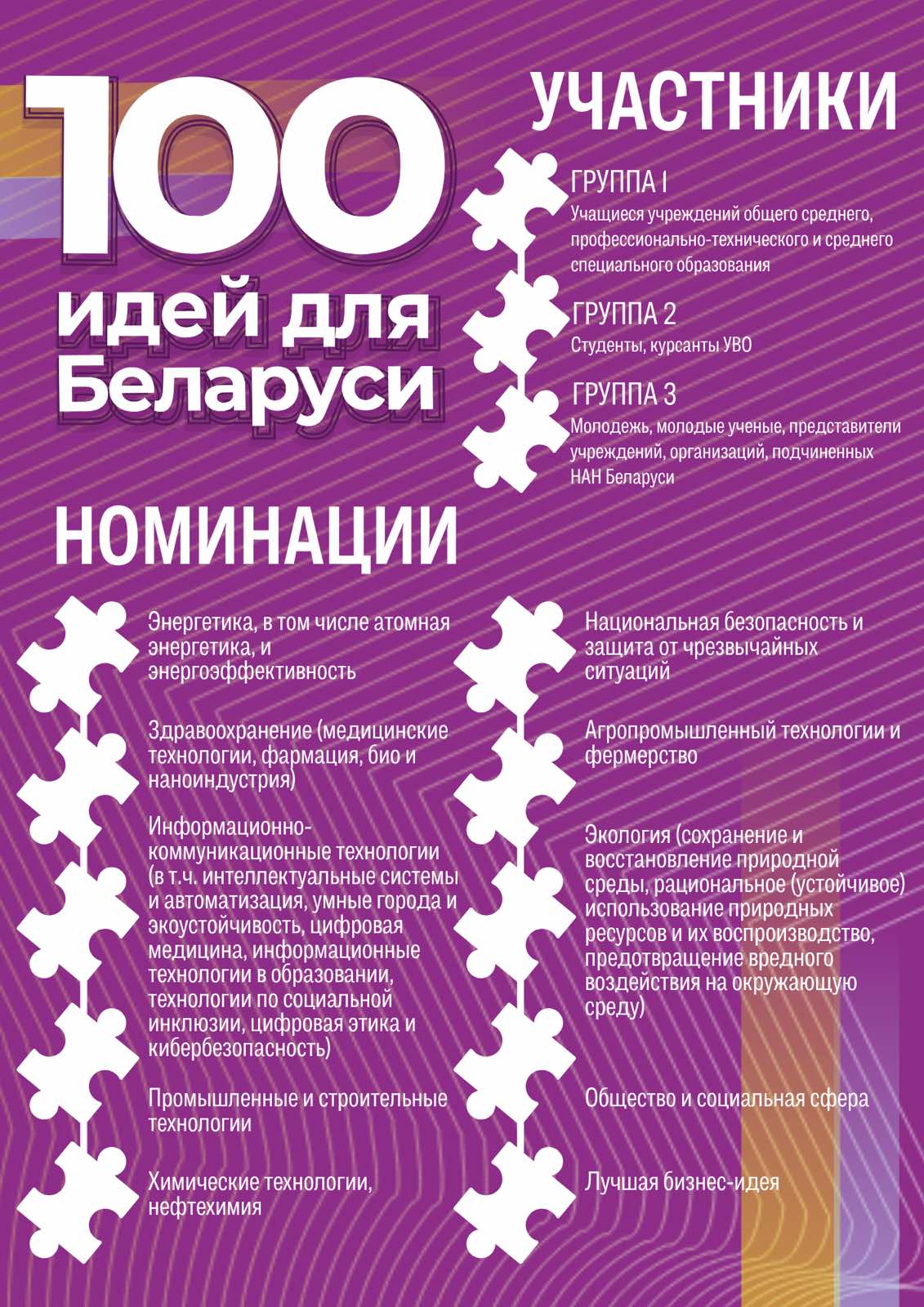 Стартовал республиканский молодежный проект «100 идей для Беларуси». Для участников необходимо подать электронные заявки, посредством заполнения формы на сайте 100ideas.by, аккумулируются Центральным комитетом ОО «БРСМ» , а ТАКЖЕ пройти по QR-коду и зарегаться для городского этапа.
